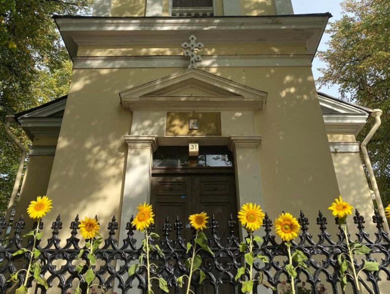 195 vuotta täyttävän Pyhän Kolminaisuuden kirkon aita oli vastikään Taiteiden yönä koristeltu auringonkukilla, joista on tullut Ukrainan symboli. Kuva: Maria Hattunen