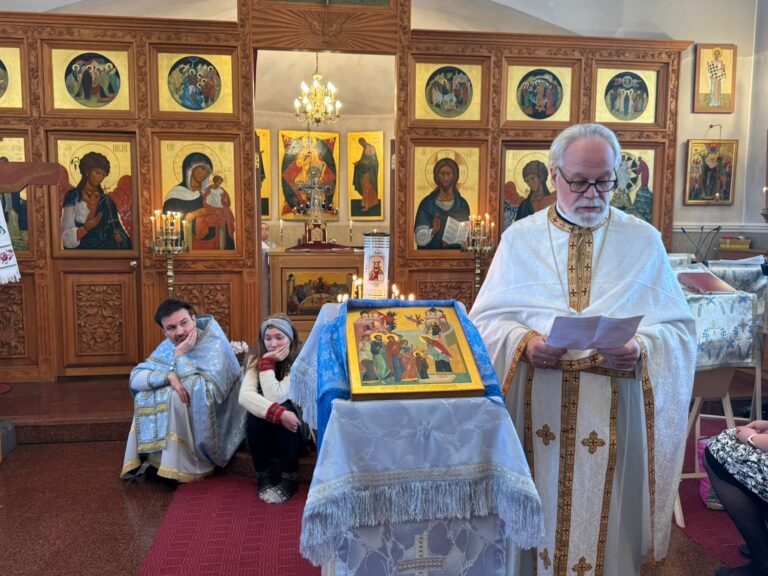 Isä Heikki Huttunen pitää saarnan Helsingin Pyhän Kolminaisuuden kirkon järjestämällä pyhiinvaelluksella Kristuksen kirkastumisen kirkossa Porvoossa. Korokkeella hänen sanojaan kuuntelevat isä Andrei Verikov ja Aino Särkelä. Teksti: Heikki Huttunen. Kuva: Khrystyna Martyniuk
