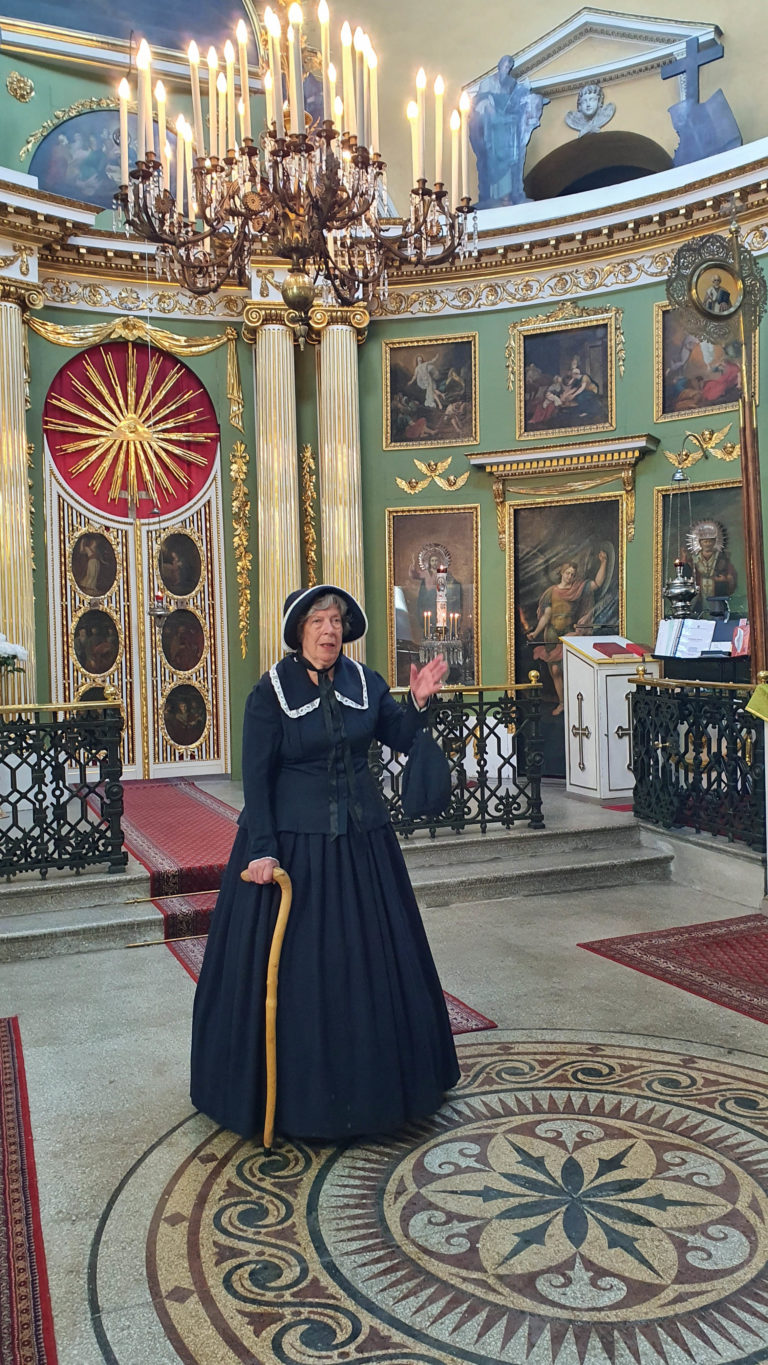 – Minutkin olisi evakuoitu Krimin sodan aikana, mutta olin saanut näyn Pyhältä Nikolaokselta ja tehtävän pelastaa tämä kirkko. Tulin asumaan kirkkoon. Kun sotilaat tulivat, kaikki ympärillä oli jo tulimerta, mutta minä oikaisin selkäni ja sanoin että vain minun ruumiini yli tuhoatte kirkon. Sotilaat olivat herrasmiehiä, he säästivät kirkon, kertoo Maria Purpuria esittävä rooliopas Pirjo Tikanoja.