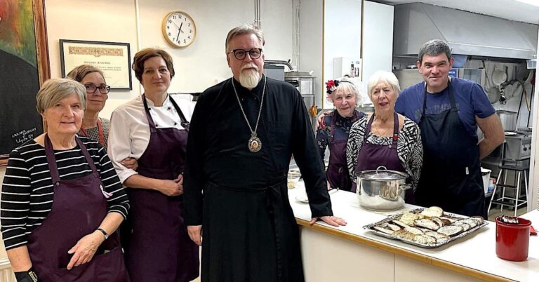 Vastikään toimeen asetettu Helsingin ja koko Suomen arkkipiispa Elia osallistui heti valintansa vahvistamisen jälkeen ensitöikseen diakoniaruokailuun. Kuvassa arkkipiispa Elian kanssa ruokailusta vastaavat seurakunramme emäntä Marina Boubentchik sekä lukuisat vapaaehtoiset. Kuva: Andreas Salminen