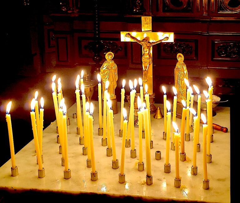 Palavat tuohukset vainajien muistopöydällä Pappilatalon Kotikirkossa. Palavat tuohukset symboloivat palavaa rukousta. Kuva: Helsingin ortodoksinen seurakunta. Teksti: Vlada Wahlstén