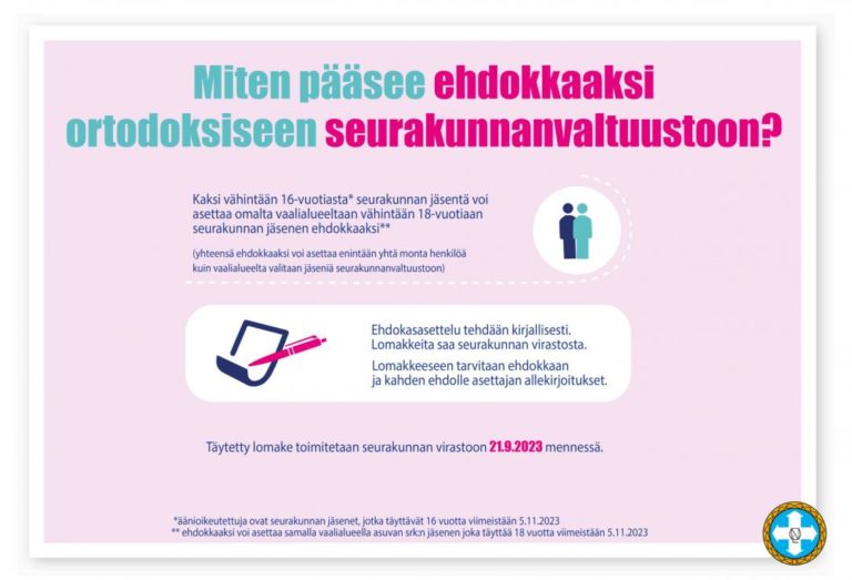 Suomen ortodoksinen kirkko: Seurakuntien valtuustovaalin ehdokasasettelu päättyy 21.9.