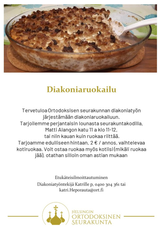 Tervetuloa Ortodoksisen seurakunnan diakoniatyön järjestämään diakoniaruokailuun.