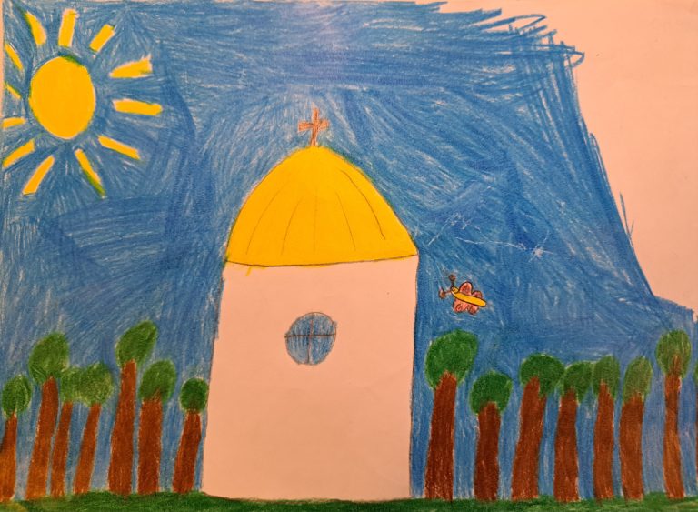 Kunniamaininnan saanut piirustus "Kirkko keskellä puita". Piirtänyt Milena Rantamäki 1. luokka.