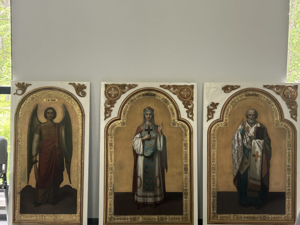 Restauroidut ikonit odottavat asettamistaan kirkon sivuseiniin. Ikonit seisovat reinustalla. Sivuseinät eivät ole kantavia ja täynnä elektroniikkaa ja siksi niihin ei voi kiinnittää ikoneita, vaan tähän keksitään erillinen kiinnitysratkaisu.