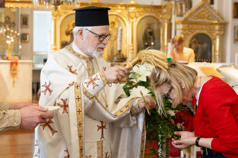 Seurakuntamme venäjän - ja ukrainankielisestä seurakuntartyöstä vastaava pappi rovasti Heikki Huttunen siunaamassa pyhitetyllä vedellä helluntain liturgian ja ristisaaton päätteeksi Hoivakoti Helenan kirkossa Helsingin Sörnäisissä. Kuva: Khrystyna Martyniuk.