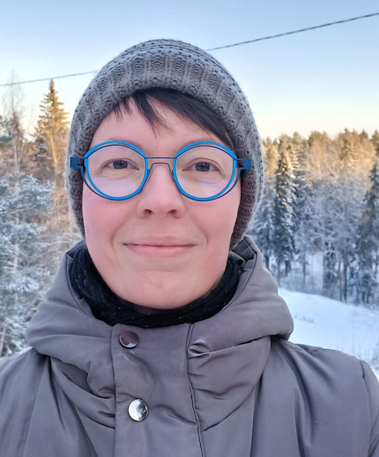 Rautaisella ammattitaidolla Helsingin hiippakunnan koronatiimiä vetävä Elina Pale hengähtää kiireen keskellä talvisilla lenkkipoluilla. Kuva: Elina Pale