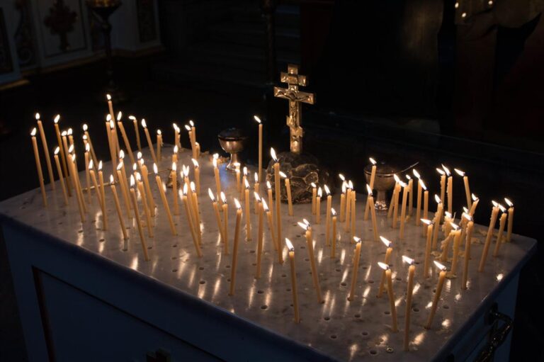 Pavavia tuohuksia vainajien muistopöydällä Uspenskin katedraalissa. Tuohukset kuvastavat palavaa rukousta. Teksti ja kuva: Vlada Wahlstén