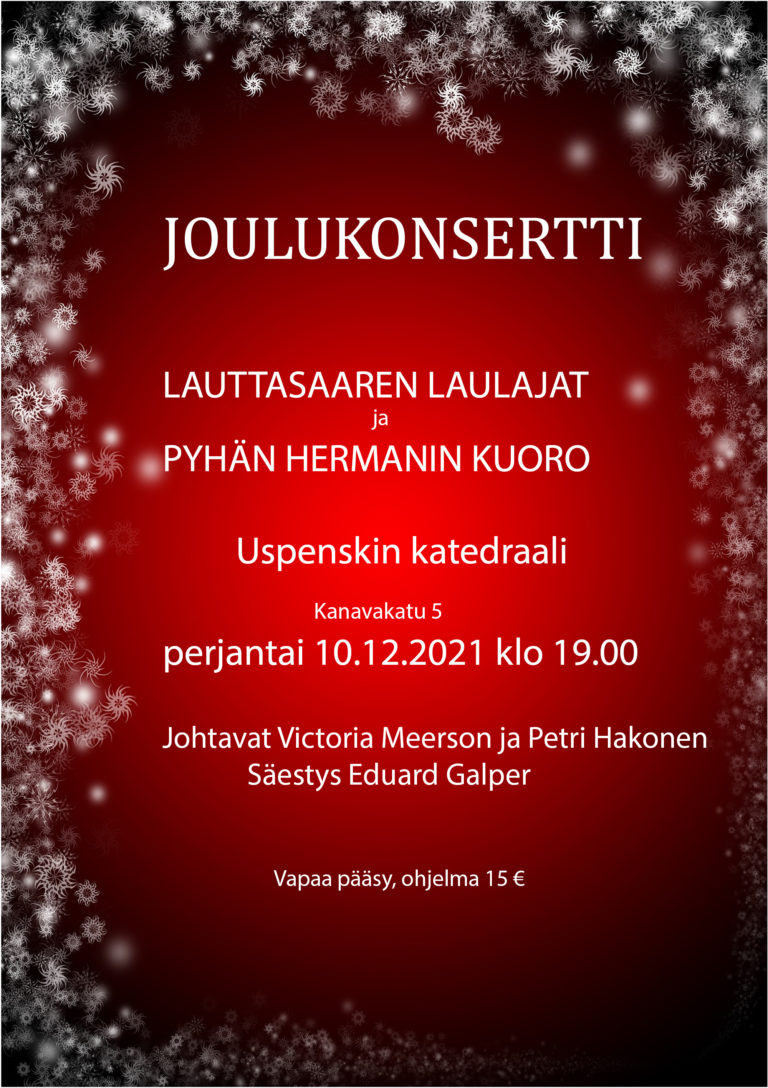 Tervetuloa huomenna perjantaina 10.12.2021 Pyhän Hermanin kuoron ja Lauttasaaren laulajien joulukonserttiin Uspenskin katedraaliin klo 19 alkaen.