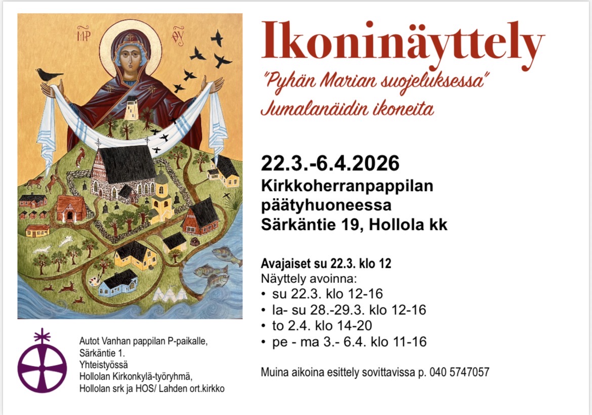 Hollolan kirkonkylässä on parhaillaan esillä ikoninäyttely Pyhän Marian suojeluksessa, joka esittelee seurakuntamme Lahden ikonipiiriläisten töitä. Esillä on yhteensä 47 Jumalansynnyttäjän ikonia.