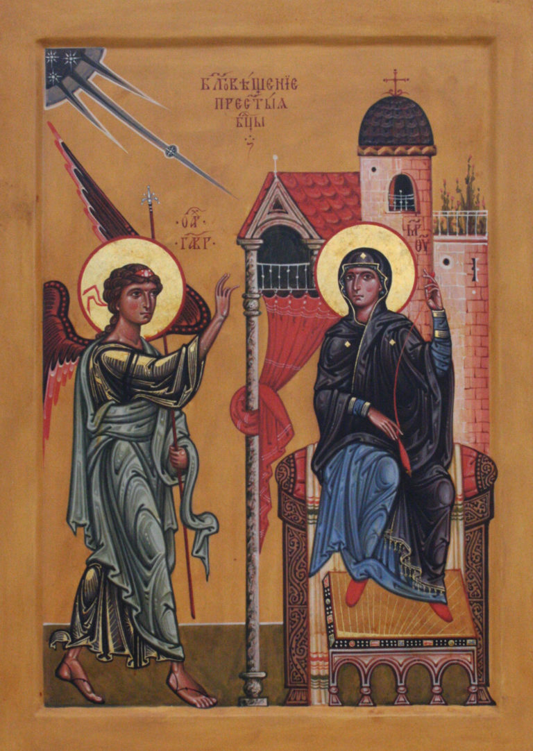 Jumalansynnyttäjän Neitseen Marian ilmestysjuhlan ikonissa enkeli Gabriel ilmoittaa neitsyt Marialle ja samalla koko ihmiskunnalle ilosanoman Jeesuksen Kristuksen syntymästä.