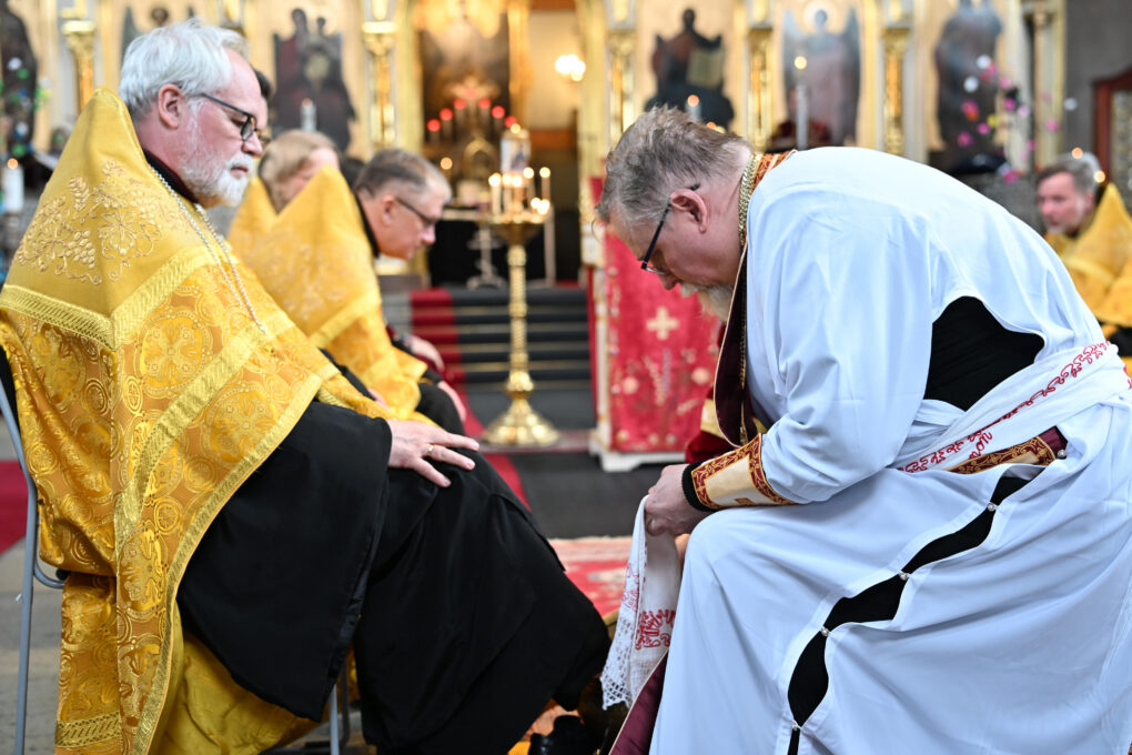 Jalkojenpesupalveluksessa arkkipiispa kuivaa jalat valkoisella liinalla, johon on kirjailtu 12 opetuslapsen nimet. Myös Juudaksen nimi on liinassa. Teksti ja kuva: Vlada Wahlsten