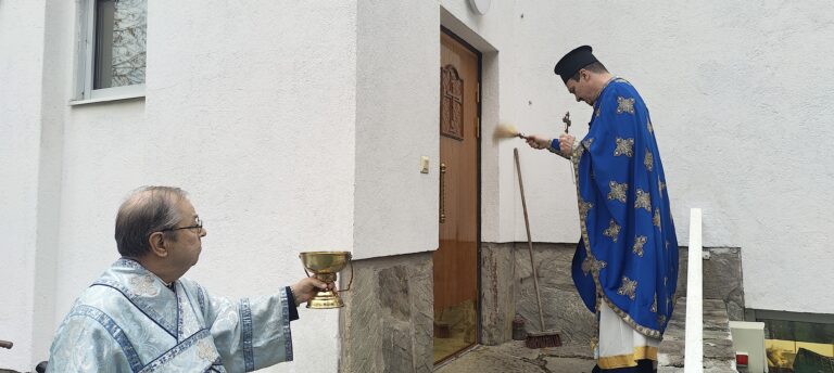 Järvenpään alueen pappi rovasti Andrei Verikov siunaa pyhitetyllä vedellä kirkon uudet alttariin johdattavat ulko-ovet. Siunaaminen toimitettiin ristisaaton yhteydessä. Kuva: Mikko Blom