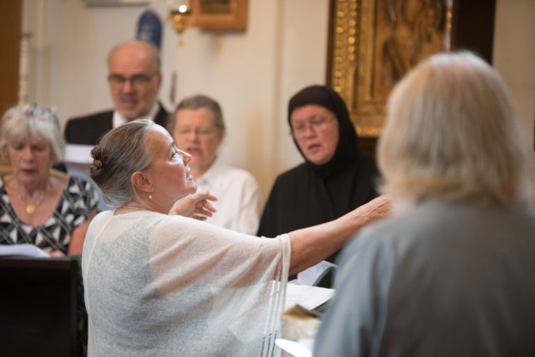 Tatjana Wilenius johtamassa hautausmaan kirkon kuoroa pyhän profeetta Elian kirkon 60-vuotistemppelijuhlassa vuonna 2018. Kuva: Miro Järnefelt