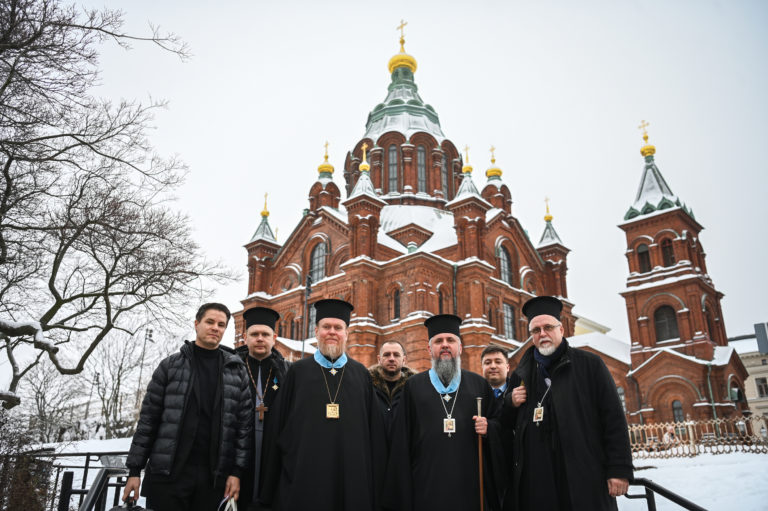 Kiovan ja koko Ukrainan metropoliitta Epifani delegaatioineen kuvattuna Uspenskin katedraalin edustalla. Kuvassa vasemmalta Helsingin hiippakunnan teologinen sihteeri Jelisei Heikkilä, isä Sergiy Berezhnoy Kiovasta, metropoliitta Jevstrati Ukrainasta, Roman Labinskyi, Kiovan ja koko Ukrainan meteopoliitta Epifani, seurueen tulkki sekä Oulun metropoliitta Elia. Kuva: Andrey Sydor