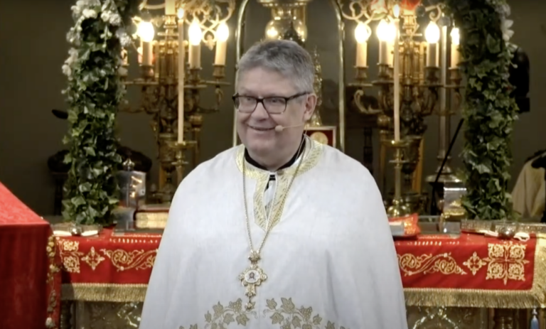Helsingin ortodoksisen seurakunnan kirkkoherra Markku Salminen piti opetuspuheen Uspenskin katedraalissa Samarialaisen naisen sunnuntain liturgiassa 18.5.2025. Kuvakaappaus liturgian suoratoiston taltioinnista. Suoratoistosta vastaa Digital Palola.