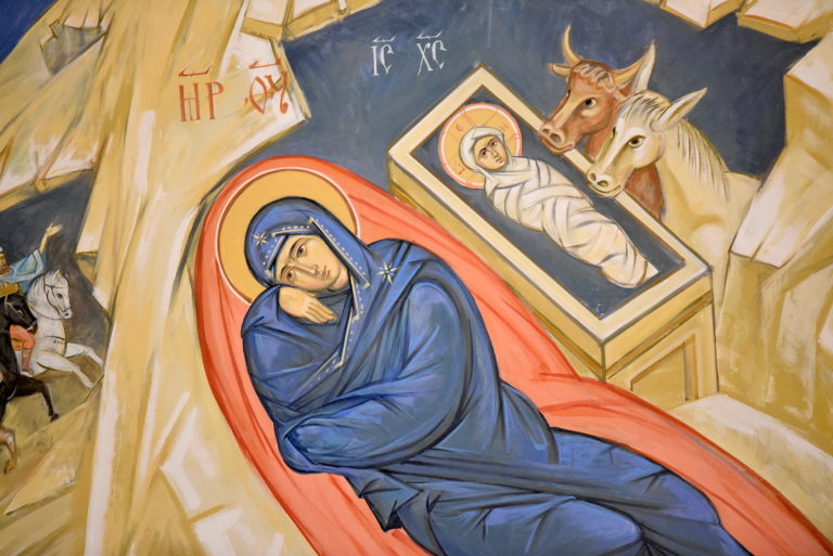 "Kuoron laulamat veisut kuvaavat koko luomakunnan osallisuutta Kristuksen syntymän juhlaan ja sen ylistämiseen." Ote Herramme Jeesuksen Kristuksen ikonista Tikkurilan kirkossa. Ikonin on maalannut Juri Mitroshin.
