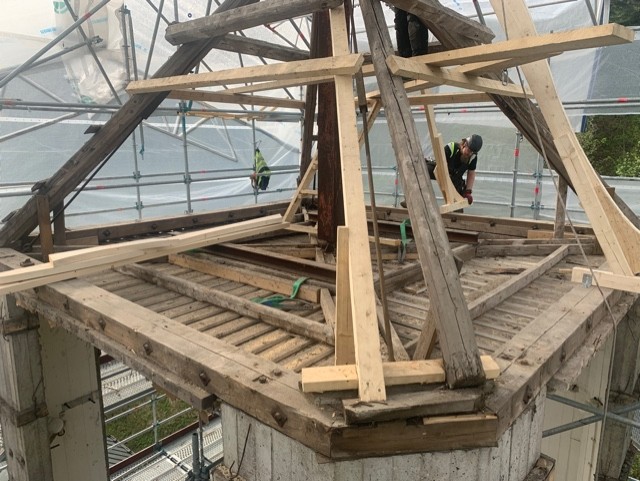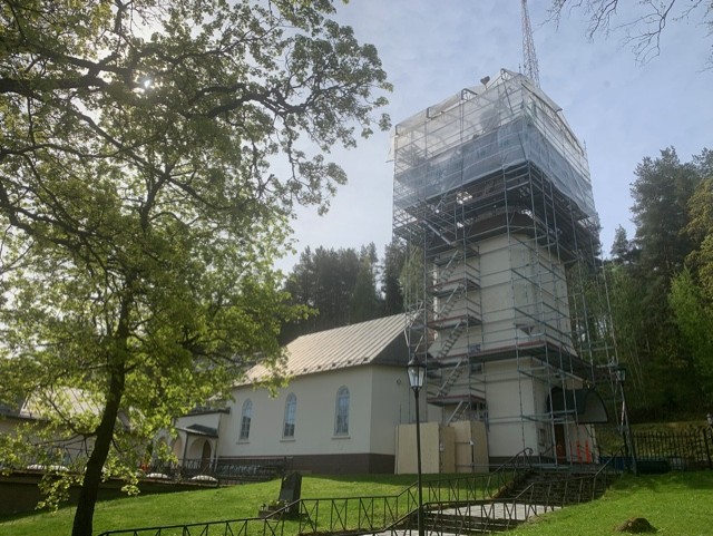 Lahden Pyhän Kolminaisuuden kirkon kellotapulin ja katon korjaukset eivät vaikuta seurakunnan toimintaan. Korjauksien on määrä valmistua heinäkuun loppuun mennessä. Kuvat: Jukka Reinikainen. Teksti: Vlada Wahsltén