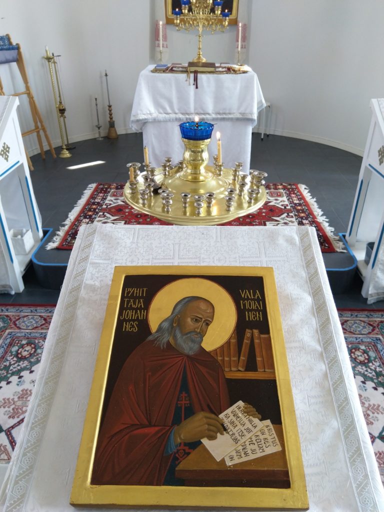Pastori Petri Korhonen siunasi tänään 13.5. Kristuksen taivaaseen astumisen juhlan liturgiassa Nummelan rukoushuoneelle lahjoituksena saadun pyhittäjä Johannes Valamolaisen ikonin. Ikonin on maalannut Nummelan ikonipiiriläinen Liisa Heikkilä opettajansa Ritva Tariman ohjauksessa.