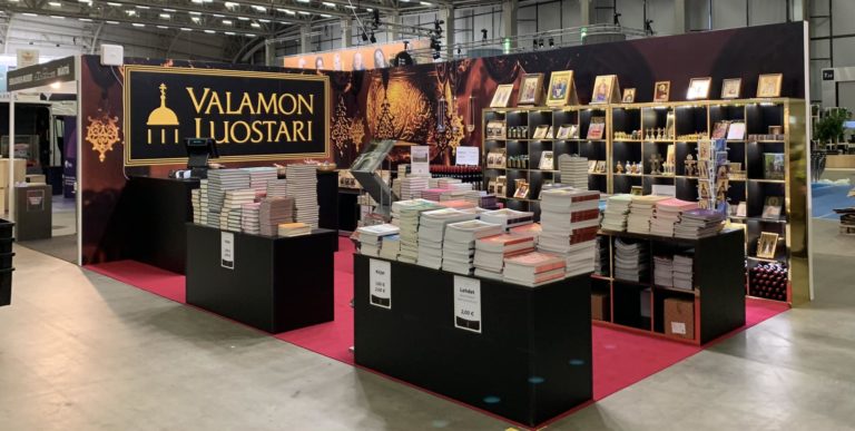 Valamon luostarin piste Helsingin kirjamessuilla valmiina ottamaan messukävijät vastaan. Kuva: Valamon luostarin Facebook-sivut