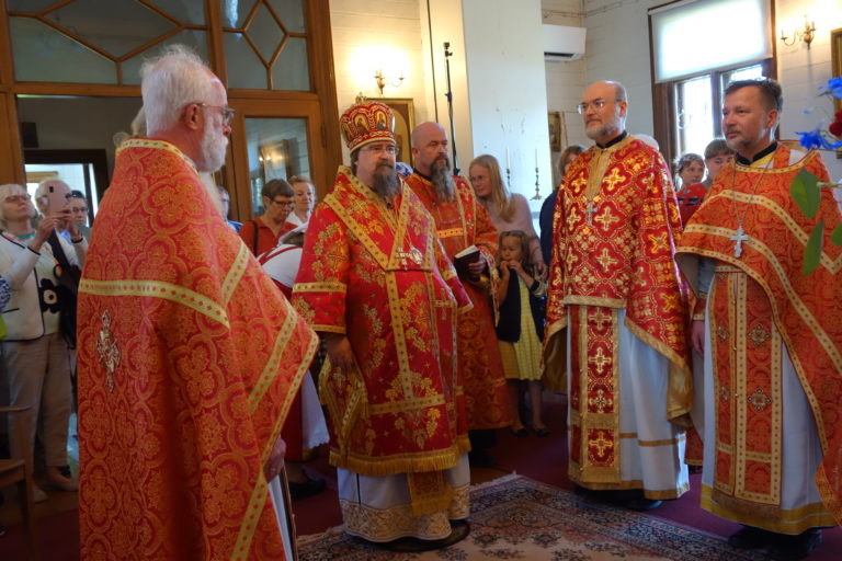 Juhlaliturgian toimittaa Haminan piispa Sergei yhdessä seurakunnan papiston kanssa. Mutta missä on restaurointimatkalle lähtenyt pyhän apostolienvertaisen Magdalan Marian ikoni? Se ei sittenkään saapunut kotiin vielä praasniekkapäiväksi vaan juuttui matkan varrelle. Onneksi analogille on saatu painokuva Magdalan Marian ikonista kirkon toisen nimikkopyhän Vladimir Kiovalaisen vieressä.
