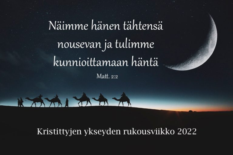 Tammikuun viimeisten viikkojen aikana vietetään ekumeenista rukousviikkoa. Tämän vuoden teema suomeksi on Näimme hänen tähtensä nousevan ja tulimme kunnioittamaan häntä (Matteus 2:2). Teofaniaan, loppiaiseen viittaavan teeman on valinnut Lähi-idän kirkkojen neuvosto. Lue lisää viikon teemasta.