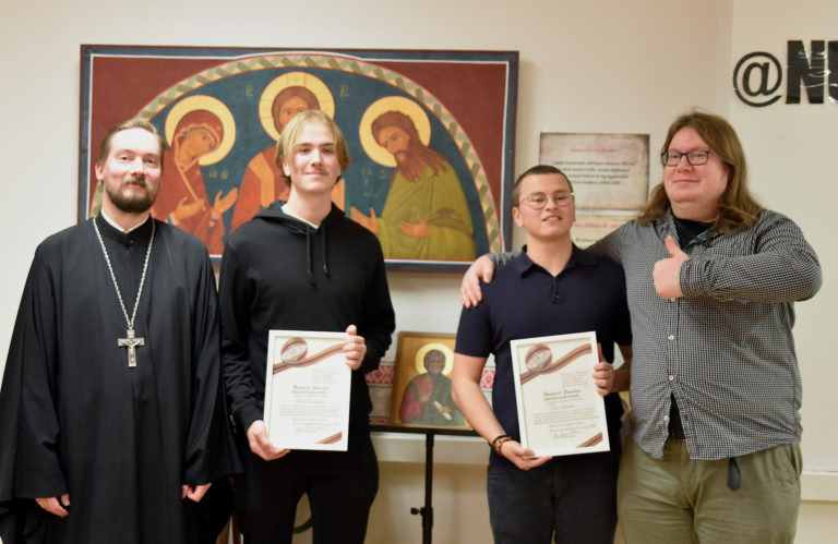 Nuoria palkittiin seurakunnan kasvatustoimen juhlan yhteydessä 30.11. Kuvassa kasvatuksen pappi isä Sergei Petsalo (vas.), palkitut Anton Raschbacher ja Felix Nesterinen ja kasvatustyöntekijä Petri Gyllström.
