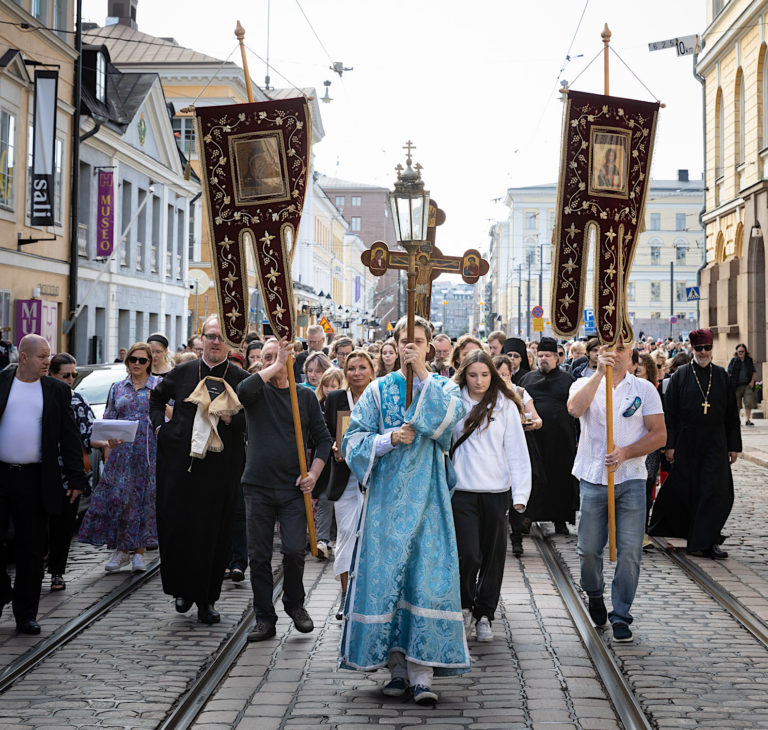 Suomen ortodoksisen kirkon autonomian 100-vuotisjuhlan ristisaatto Helsingissä Pyhän Kolminaisuuden kirkosta Uspenskin katedraaliin patriarkaaliseen kiitosrukouspalvelukseen keräsi ennennäkemättömän määrän osanottajia eri puolilta Suomea. Kuva: Jyri Pitkänen