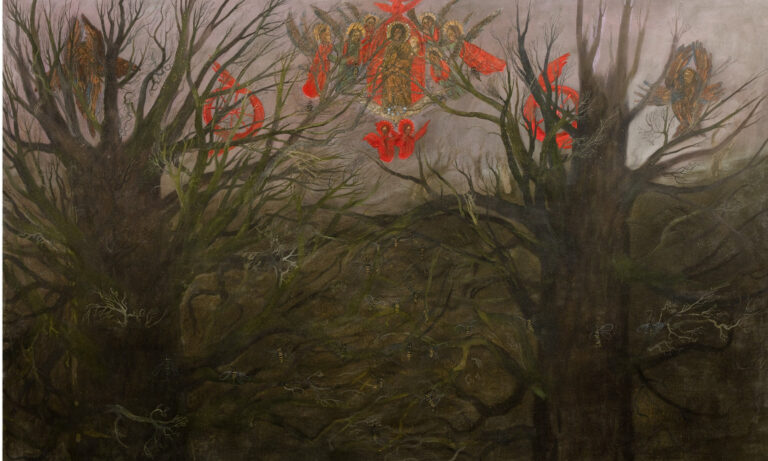 Taiteilija Elina Merenmies: Taivaalliset sotajoukot, 2022 tempera ja öljy kankaalle 169 x 310 cm kuva: Jussi Tiainen /Galerie Anhava