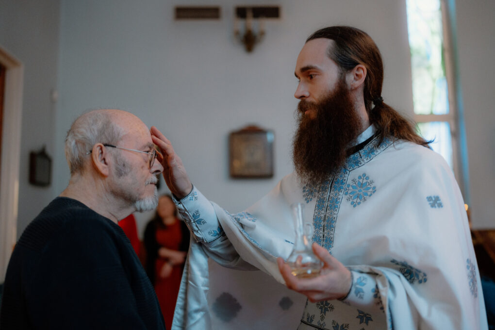 Kirkkoon liittettävät katekumeenit pitävät liturgiassa palavia tuohuksia mirhavoitelusakramentin edellä. Teksti ja kuva: Vlada Wahlstén