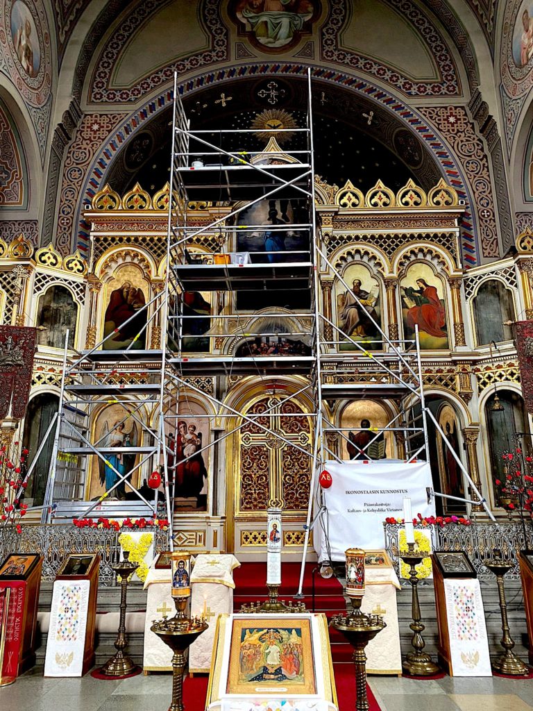 Uspenskin katedraalissa kävijää odottaa erilainen näkymä. Katedraalin ikonostaasin konservointi on edennyt aikataulun mukaisesti, ja korjaamiseen vaadittavat telineet ovat siirtyneet ikonostaasin keskelle alttariovien kohdalle.