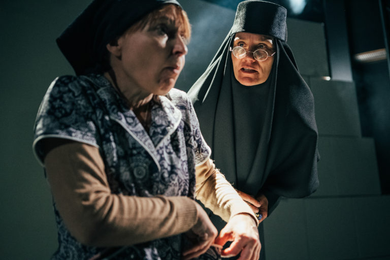 Rooleissa nähdään Laura Malmivaara ja Irina Pulkka. Häkellyttävän muuntautumiskykyinen Malmivaara vaihtaa rooleja lennossa mm. Jumalasta luostarin igumeniaksi ja Brita Kekkoseksi.