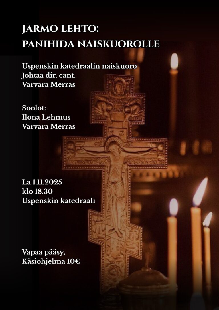 Karjalan valistajien juhlapäivän ja pyhäinpäivän iltana 1.11. on Uspenskin katedraalissa jo perinteeksi muotoutunut Panihida-konsertti. Tällä kertaa konsertissa esiintyy projektikokoonpano Uspenskin katedraalin naiskuoro, joka esittää Jarmo Lehdon naiskuorolle säveltämän Panihida-teoksen. Kuoroa johtaa ja soolo-osuuksia laulaa dir.cant. Varvara Merras-Häyrynen. Toisena solistina konsertissa on Ilona Lehmus.