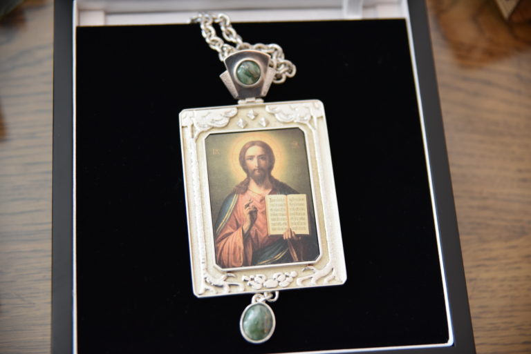 Evakko-Kristuksen ikoni on erityisen rakas myös arkkipiispa Leolle, joka on itsekin kokenyt pakolaisuuden. Enkolpionin kivet ovat Kittilän marmoria, ja se on tehty kierrätysmetallista ja hopeitu kierrätyshopealla. Kuva: Vlada Wahlsten