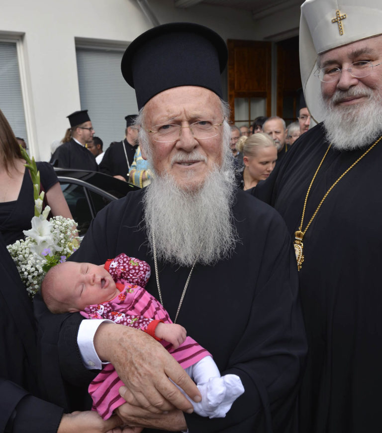 Ekumeeninen patriarkka Bartolomeos vastasyntynyt vauva sylissään Tikkurilan ortodoksisella kirkolla vuonna 2013. Patriarkka Bartolomeos tunnetaan vihreänä patriarkkana, joka on väsymättä puhunut luonnonsuojelun ja luomakunnan puolesta. Paimenkirjeessään hän nostaa esille, kuinka luomakunnan oikeudet nivoutuvat yhteen ihmisoikeuksien kanssa. Kuva: Pentti Potkonen