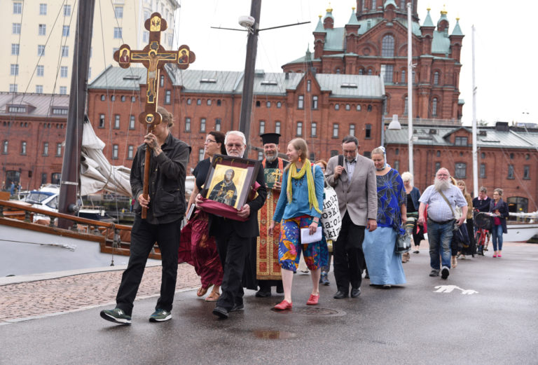 We start at 16.30 in the crypt of the Uspenski cathedral. From the crypt we continue to the the crypt of the Helsinki Lutheran cathedral, about 17. From there we continue to the chapel of the Birth of the Mother of God where the evening prayer will be celebrated in Swedish at about 17.30. After this we proceed to Kotikirkko where we will eat a light evening meal after finishing the procession.