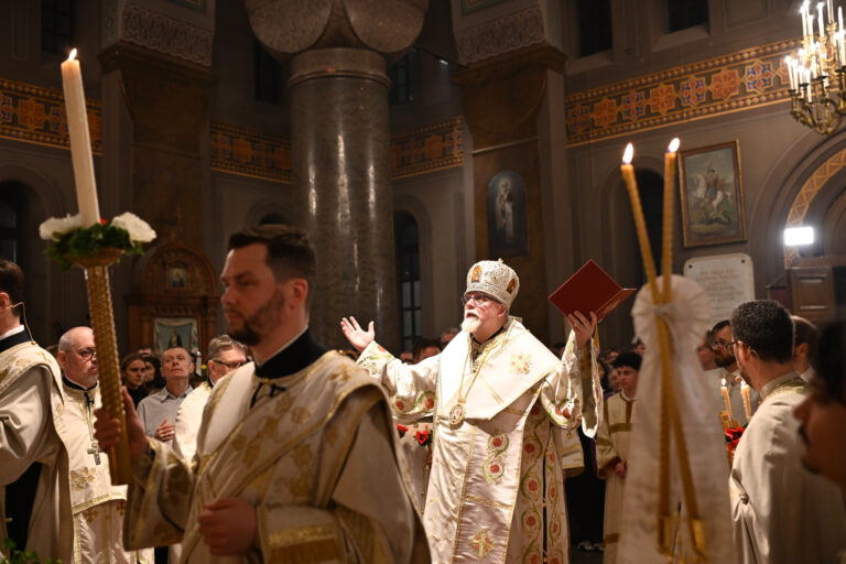 Arkkipiispa Elia toimitti pääsiäisyön jumalanpalveluksen Uspenskin katedraalissa. Palvelus myös televisioitiin. Kuvassa etualalla vasemmalla Helsingin hiippakunnan ylidiakoni Andreas Salminen. Teksti ja kuva: Vlada Wahlstén