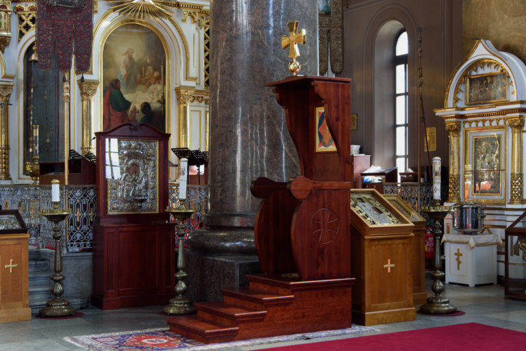 Piispanistuin sijaitsee Uspenskin katedraalin kirkkosalissa ikonostaasin oikealla puolella. Kuva: Joel Eklöv
