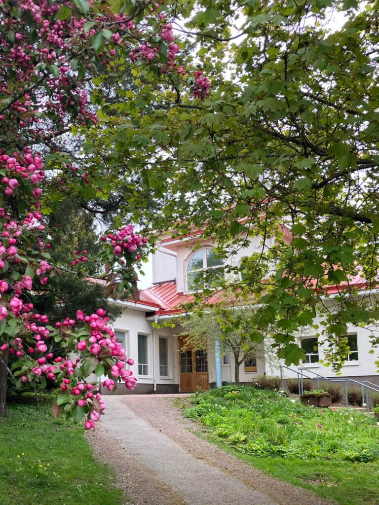 Kristuksen taivaaseenastumisen kirkko Tikkurilassa viettää helatorstaina vuosijuhlaansa. Pyhäkön puut ja istutukset ovat sopivasti kukkaloistossaan juhlapäiväksi. Kuva: Teija Haussalo.