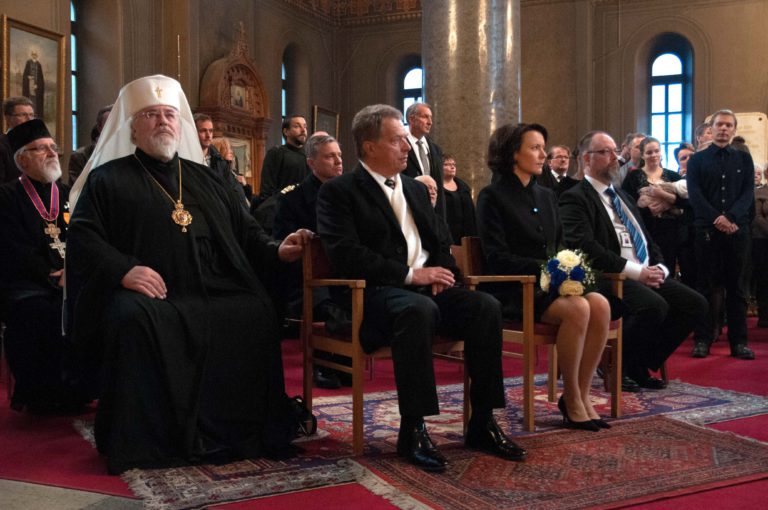Presidentti Niinistö ja rouva Jenni Haukio osallistuivat itsenäisyyspäivän rukouspalvelukseen vuonna 2014 Uspenskin katedraalissa.