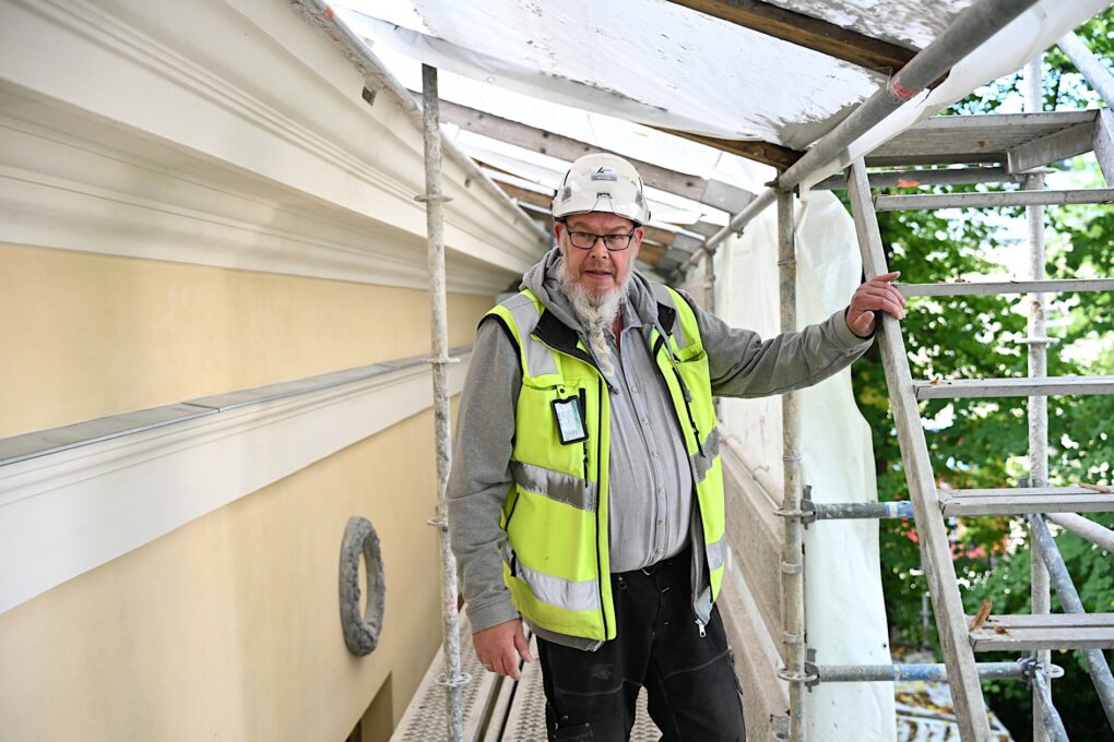 ”Pellille tulee laittaa kolot. Tässä käytetään vanhaa kiinnitystä. Rappaajat laittavat vielä rappauksen niin, että pelti sopi julkisivuun eikä jää mitään aukkoja”.