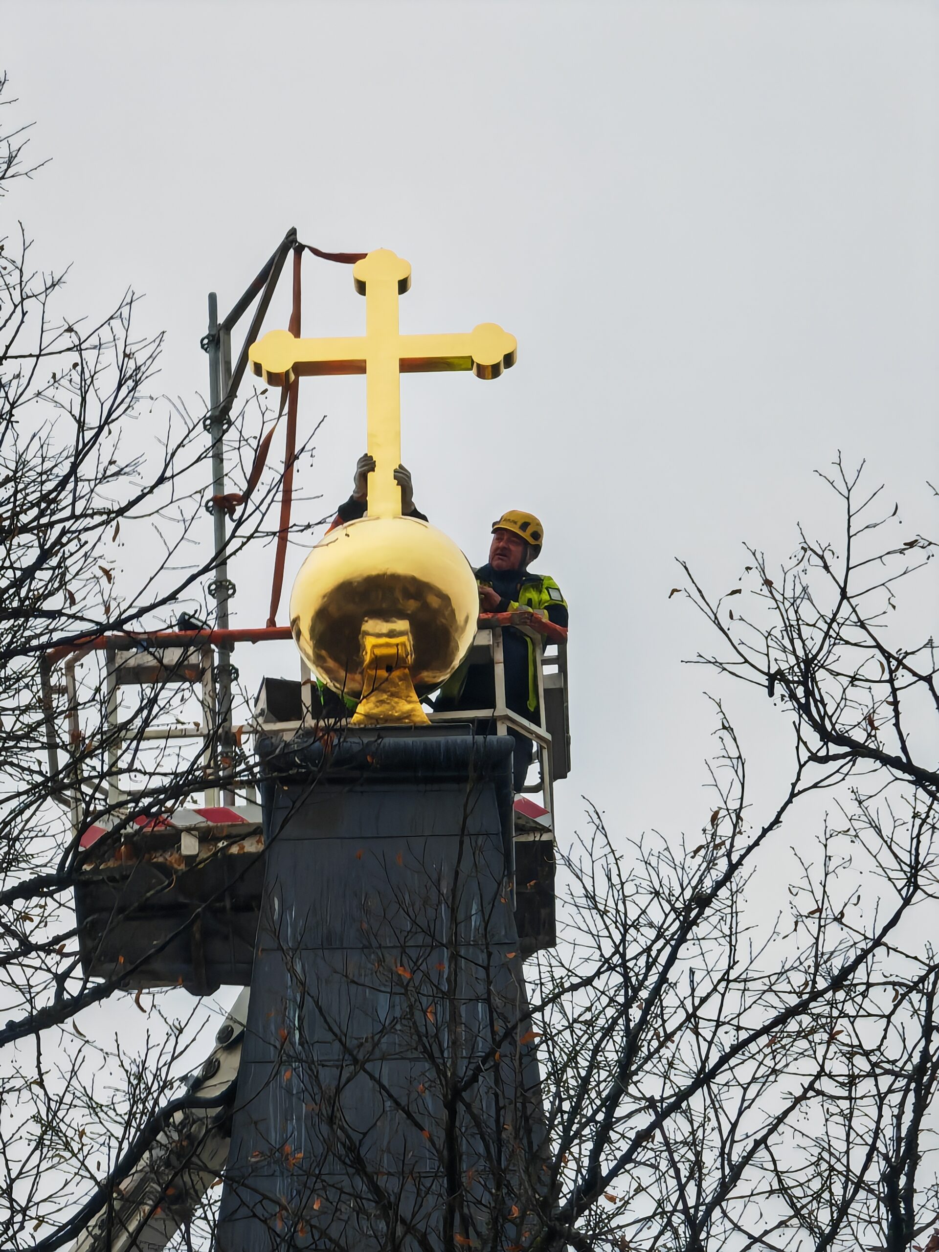 Kirkon kaolla lähikuvassa kullattu risti nostettuna paikoilleen ja ristin vieressä työmies telemässä viimeistetytöitä nosturista käsin.