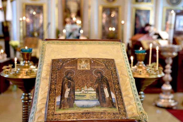 Pyhittäjäisä Sergei ja Herman Valamolaisten ikoni analogilla Pyhän Kolminaisuuden kirkossa Helsingissä. Kuva: Vlada Wahlstén