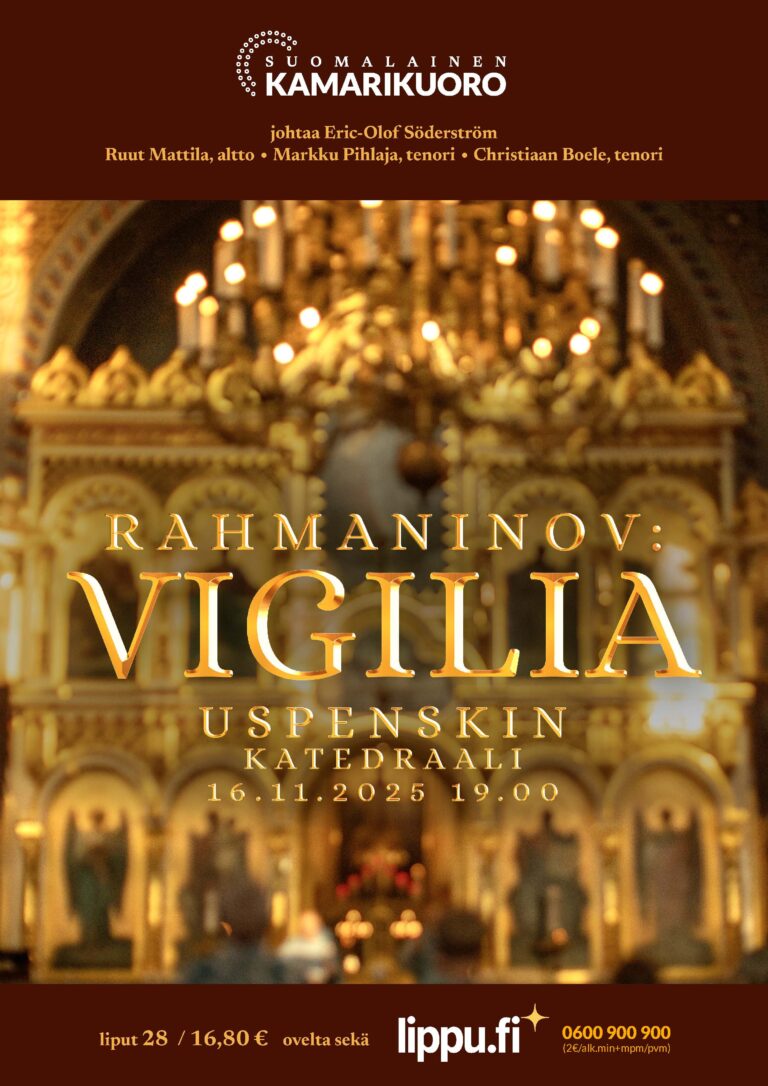 Pyhän apostoli ja evankelista Matteuksen päivänä, joulupaaston ensimmäisenä sunnuntaina katedraalissa voi päästä kuulemaan yhtä kirkollisen musiikkimme helmeä: Rahmaninovin vigilian, jonka esittää Suomalainen kamarikuoro 16.11. kello 19. Kamarikuoroa johtaa Eric-Olof Söderström.