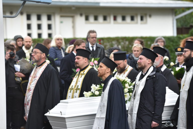 Haudalla kukkalaitteet laskettiin monesta seurakunnasta sekä Ortodoksisten Nuorten Liitolta, Filanropialta sekä Viron Ystävyys Seuralta. Isä Jyrki toimi aiemmin pitkään seurakuntamme pappina sekä Pohjoisen ja Lapin seurakuntien kirkkoherrana. Isä Jyrki sai tänä keväänä korkeimman Ortodoksisten Nuorten Liiton tunnustuksen, kultaisen ansiomerkin työstään lasten ja nuorten parissa. Hän oli myös toiminut vuosia Viron Ystävyysseuran puheenjohtajana ja oli suuri kirkkomme kansainvälisen diakonia- ja lähetysjärjestö Filantropian ystävä. Isä Jyrkin toiveen mukaisesti muistamiset pyydettiin ohjaamaan Filantropian Itä-Afrkan työn tilille.