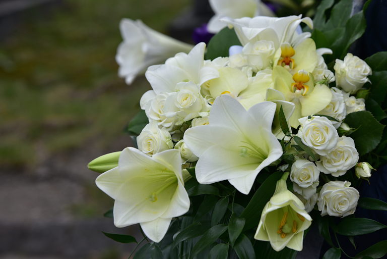 Valkoinen kukkalaite laskettiin rovasti Raimo Poreksen haudalle. Kuva: Vlada Wahlstén