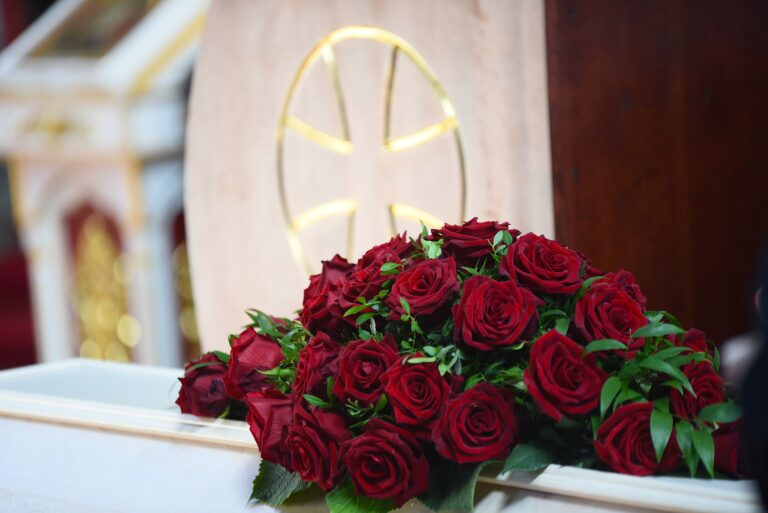 Punaiset ruusut rovasti Veikko Purmosen arkun päällä. Kuvat: Vlada Wahlstén