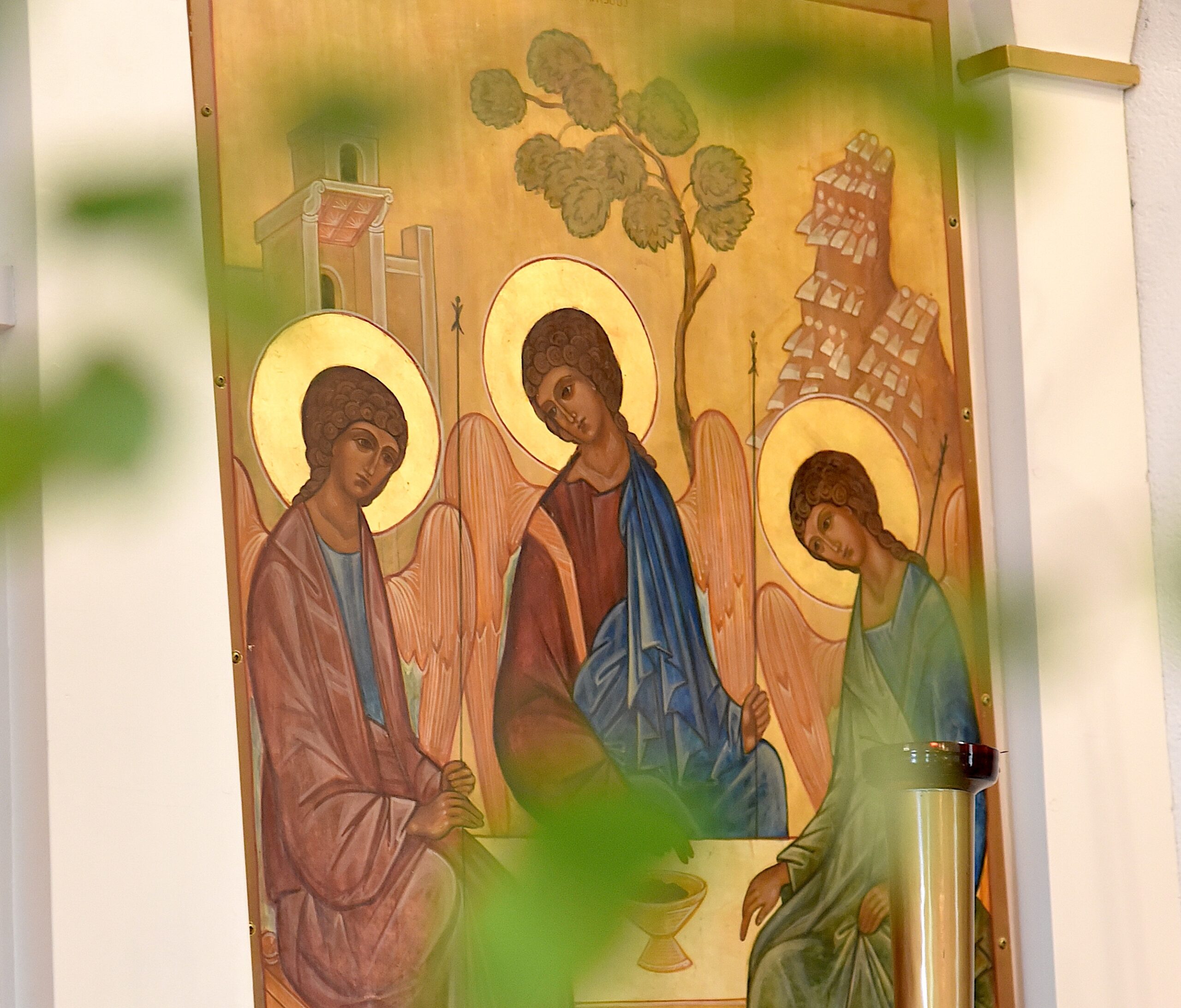 Икона Святой Троицы в иконостасе православного храма Лахти. На переднем плане — берёзовые ветви, традиционно украшающие храм на Пятидесятницу. Храмы в этот день часто украшают ветвями берёзы и цветами. Прихожане также приносят с собой букеты цветов, символизирующие новую жизнь, дарованную через Крещение Святым Духом. Литургический цвет Пятидесятницы — зелёный. Текст и фото: Влада Валстен.