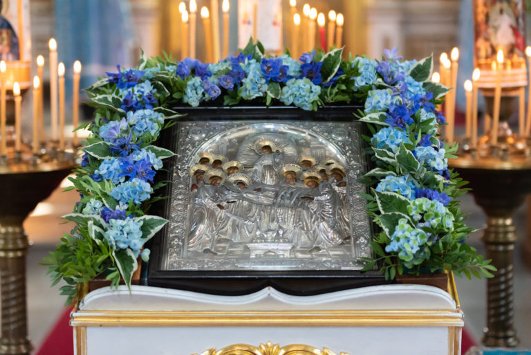 В молитвах неусыпающую Богородицу / и в ходатайствах надежду непоколебимую / гроб и смертность не удержали. / Ибо Её как Матерь Жизни к жизни перенес / Вселившийся в Её чрево вечно девственное.