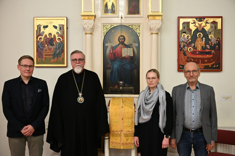 Tarkastuksen oli suorittanut lokakuussa Helsingin hiippakunnan piispa, arkkipiispa Elia, yhdessä nimeänsä tarkastusseurueen kanssa, johon kuului palvelukeskuksen johtaja Jari Rönkkö (vas.) ja lakimies Jouni Heino (oik). Tarkastuksen sihteerinä toimi hallintosihteeri Annaleea Kemppainen. Teksti ja kuva: Vlada Wahlstén